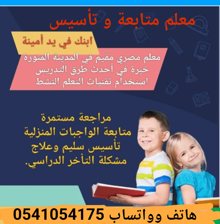 معلم مصري معلم مصري مقيم في المدينة المنورة خبرة طويلة في أحدث طرق التدريس واستخدام تقنيات التعلم النشط، مثالي للباحثين عن مدرس تأسيس، مراجعة، متابعة الواجبات وعلاج التأخر الدراسي. متابعة الواجبات المنزلية بانتظام. مراجعة مستمرة لجميع المواد. تأسيس قوي للطلاب في جميع المراحل الدراسية. علاج مشكلة التأخر الدراسي بخطط فعالة. شرح مبسط باستخدام أساليب حديثة تساعد الطالب على الفهم والاستيعاب. الموقع المدينة