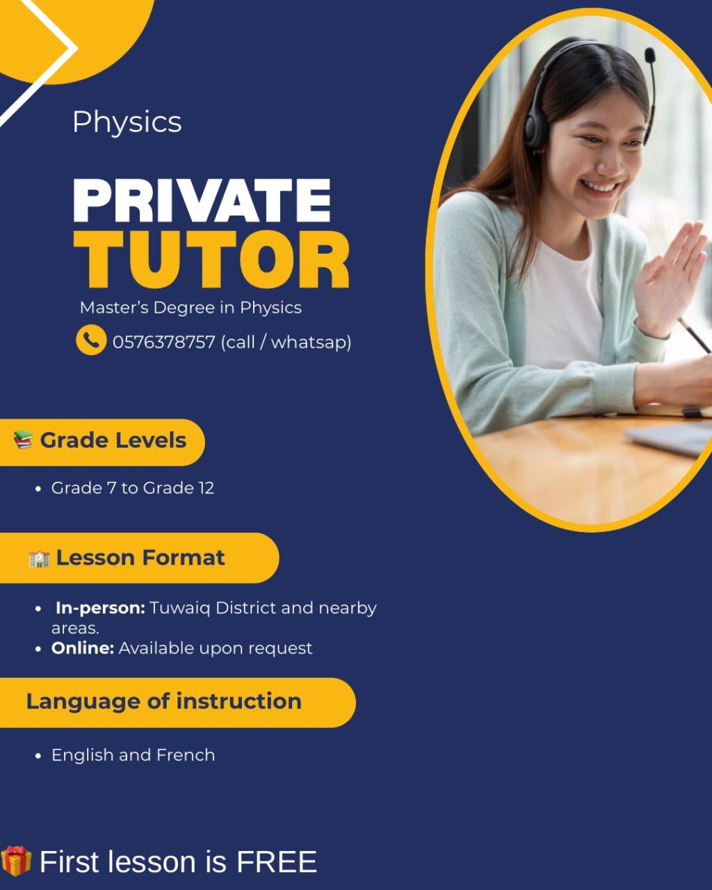 مدرسة فيزياء خصوصي - الرياض (حي الطويق) حاصلة على ماستر 2، بخبرة في تبسيط المفاهيم الفيزيائية وشرحها بأسلوب واضح ومناسب لجميع المستويات. المراحل الدراسية المرحلة المتوسطة المرحلة الثانوية طريقة الدروس حضوري داخل حي الطويق والمناطق القريبة أو اونلاين حسب الرغبة الحصة الأولى مجانا للتجربة السعر حسب المرحلة وعدد الحصص رقم التواصل (واتساب / اتصال)