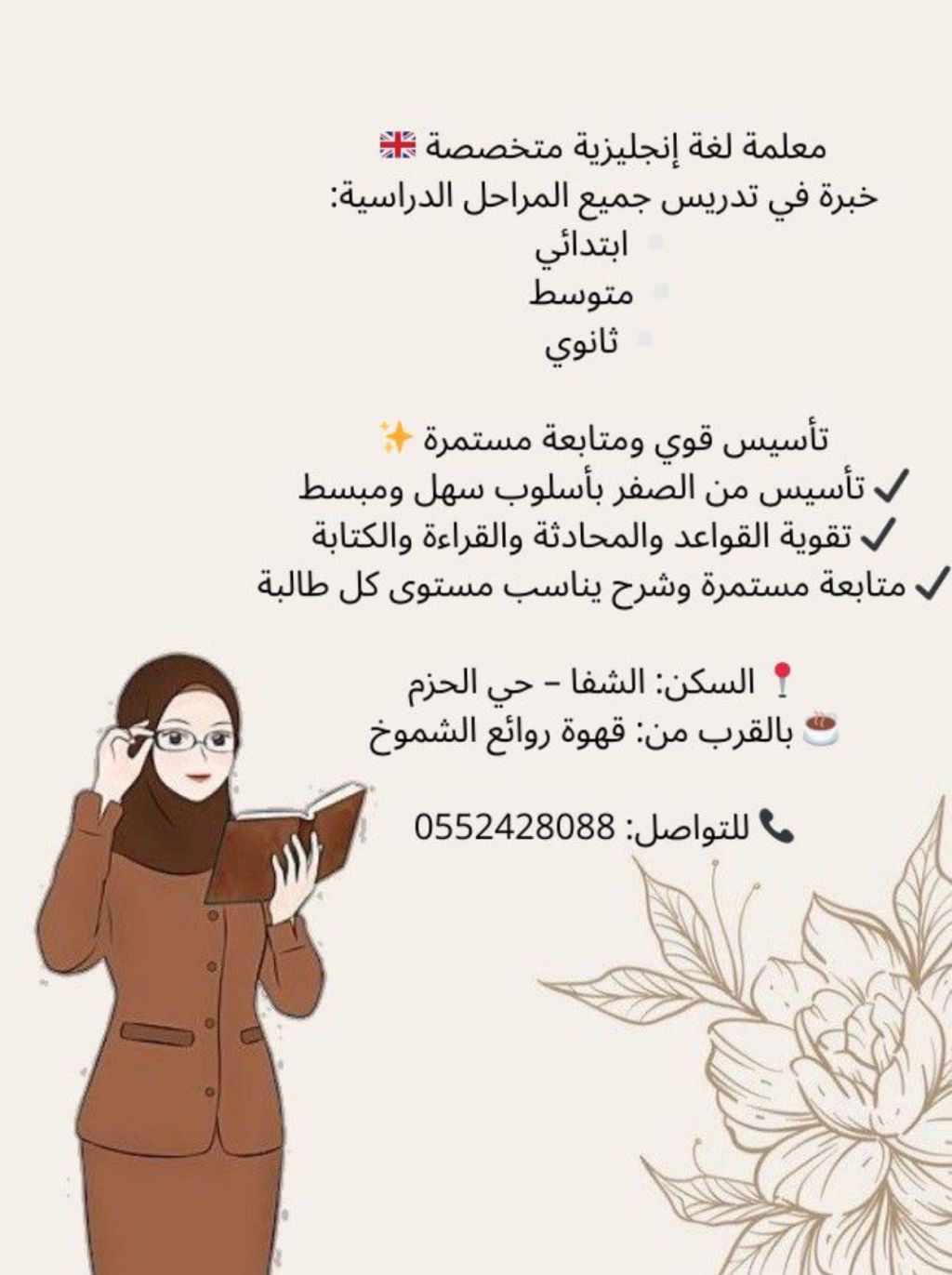 معلمه لغة انجليزيه خبرة في تدريس جميع المراحل الدراسية بنات ابتدائي متوسط ثانوي تأسيس قوي ومتابعه مستمرة تأسيس من الصفر بأسلوب سهل ومبسط تقوية القواعد والمحادثة والقراءة والكتابة متابعه مستمرة وشرح يناسب مستوى كل طالبه الشفا حي الحزم