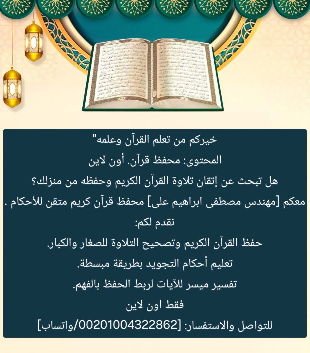 خيركم من تعلم القرآن وعلمه "المحتوى محفظ قرآن. أون لاين هل تبحث عن اتقان تلاوة القرآن الكريم وحفظه من منزلك معكممهندس مصطفى إبراهيم على محفظ قرآن كريم متقن للاحكام. نقدم لكم حفظ القرآن الكريم وتصحيح التلاوة للصغار والكبار. تعليم احكام التجويد بطريقة مبسطة. تفسير ميسر للايات لربط الحفظ بالفهم. فقط أون لاين للتواصل والاستفسار