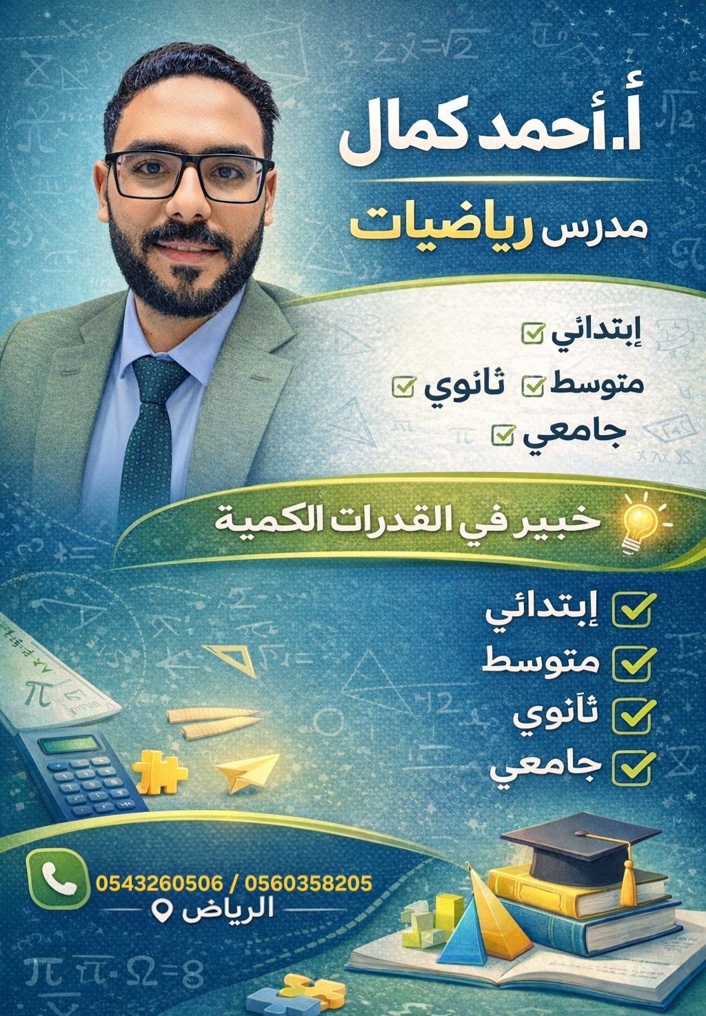 خبير في القدرات الكمية (تأسيس - تدريب مكثف - حل نماذج اختبارات - استراتيجيات الحل السريع) شرح مبسط يساعد الطالب على الفهم العميق وليس الحفظ فقط متابعة مستمرة مع الطالب لضمان التحسن والتفوق تدريب على الاختبارات ورفع مستوى التحصيل الدراسي استخدام أساليب حديثة وممتعة في شرح الرياضيات هدفي هو تحويل الرياضيات من مادة صعبة الى مادة سهلة ومحببة للطلاب، مع تحقيق أفضل النتائج