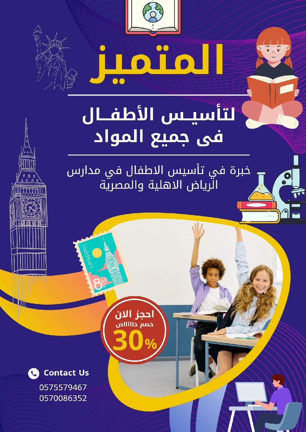 المتميز لتأسيس الاطفال في جميع المواد الدراسية. خبرة في تأسيس الاطفال والمرحلة الابتدائية شرح وافي وتدريبات وجوائز قيمة للمتفوقين. دفتر متابعة لكل طفل تعليم الكمبيوتر. مناهج أثرائية للمتفوقين وعلاجية للمتوسطين والضعاف. سارع بالحجز الآن