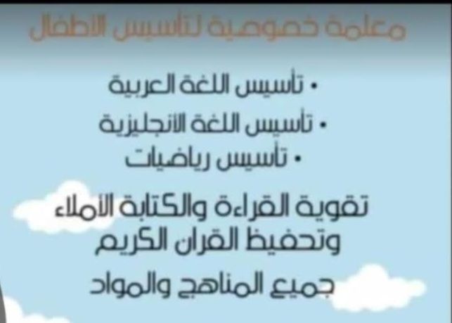 معلمة خصوصية لتأسيس. ومتابعة المنهج حتى نهاية العام الدراسي. تحفيز وترغيب الطلبه لدروس والتعليم. ادخال وسائل حديثة في توصيل المعلومة وتر سيخها. خصومات خاصة للأخوة. المكان حي لبن وماجاورها