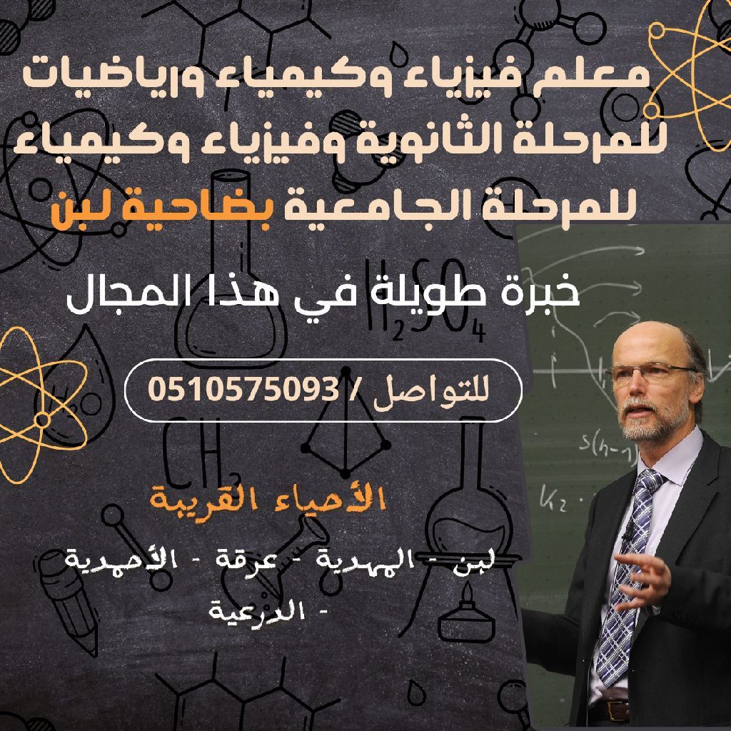Physics, Chemistry, and Mathematics teacher for high school, and Physics for university level, located in Dhahiyat Laban. Extensive experience in this field. For contact Nearby areas Laban - Al - Mahdiyah - Irqah - Al - Ahmadiyah - Ad - Diriyah