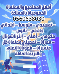 أكبر تجمع معلمين ومعلمات في المملكة لجميع المراحل والتخصصات رياضيات - انجليزي - كورسات محادثة - فيزياء - كيمياء - أحياء - مناهج الانترناشونال - قدرات كمي ولفظي - تحصيلي علمي وأدبي - معلمات ظل وتربية خاصة - شرح مناهج كليات الهندسة - صعوبات التعلم - فرط الحركة - تشتت الانتباه - نقدم لكم خدمات تعليمية احترافية من خلال نخبة من أفضل المعلمين والمعلمات في المملكة، المتخصصين في تدريس جميع المراحل الدراسية، بداية من المرحلة