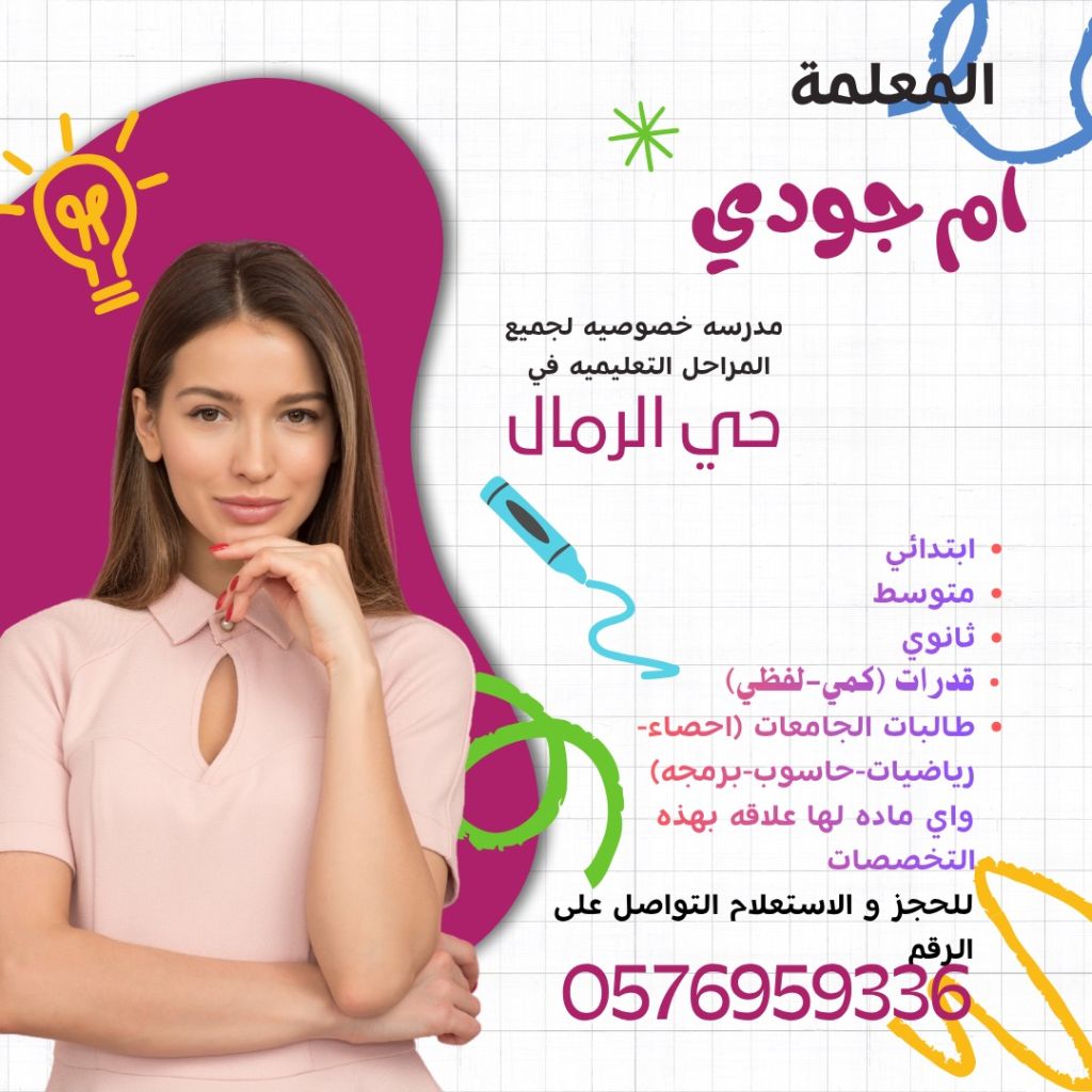 Private lesson teacher in Riyadh, Al - Remal neighbourhood, in the student's house or the teacher's house. Teacher abilities and all educational stages (primary - intermediate - secondary) and for female university students who study statistics, mathematics, computer and any subject related to these specialisations. Communicating information in a simplified and easy way and solving duties