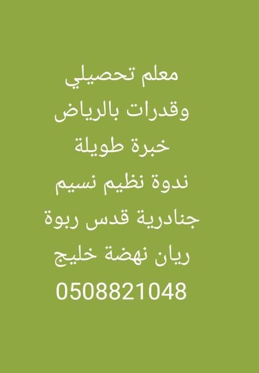 أستاذ قدرات - أستاذ تحصيلي - مدرس قدرات روضة نسيم نهضة يرموك حمراء وحولها تأسيس من الصفر حتى الحصول على أعلى التقديرات بفضل الله. خبرة أكثر من 15 سنة خبرة طويلة في تدريس مادة القدرات (لفظي + كمي) تأسيس + حل نماذج. التحصيلي - خبرة كبيرة في تجهيز الطلاب لاختيار التحصيلي (تأسيس + حل تسريبات) متابعة دورية للطالب بشكل يومي على كروب