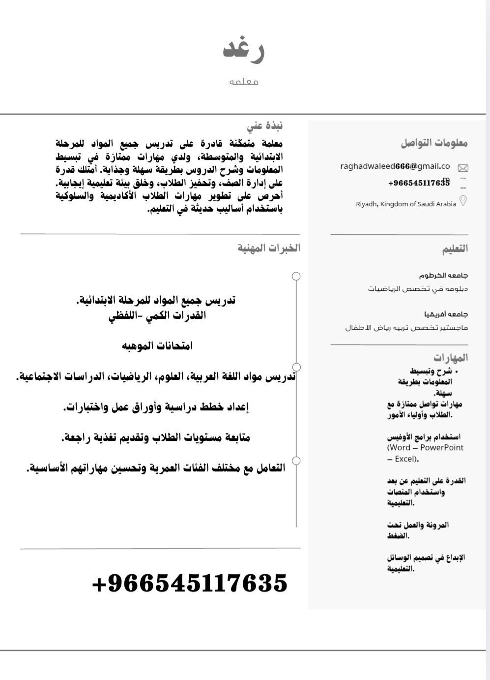 معلمة متمكنة قادرة على تدريس جميع المواد للمرحلة الابتدائية والمتوسطة، والقدرات الكمي واللفظي وامتحانات الموهبة ولدي مهارات ممتازة في تبسيط المعلومات وشرح الدروس بطريقة سهلة وجذابة. امتلك قدرة على إدارة الصف، وتحفيز الطلاب، وخلق بيئة تعليمية ايجابية. أحرص على تطوير مهارات الطلاب الأكاديمية والسلوكية باستخدام أساليب حديثة في التعليم