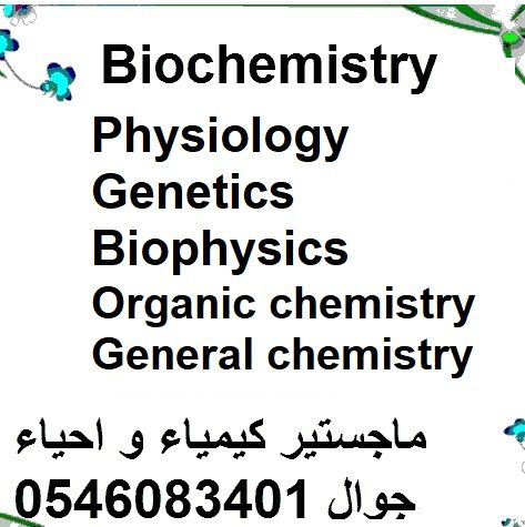 مدرس كيمياء حيويه وعامة وأحياء وفيزياء للجامعة سهولة في توصيل المعلومه ماجستير كيمياء وأحياء 0546083401 كيمياء حيوية - كيمياء عضوية الاروماتيه - الديناميكا الحراريه - الكيمياء العضوية الأليفا تيه - الكيمياء التحليلية الوزنيه - كيمياء عامة - كيمياء العناصر الانتقالية أحياء عامة - مناعة - وراثة - فيزياء - طبية - فيزياء حديثة - مصطلحات طبية كتابة الأبحاث العلمية نظام الدراسة اونلاين