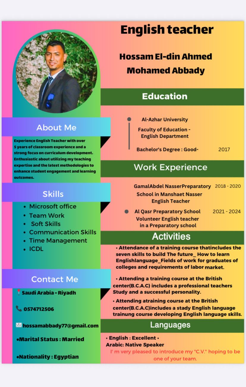 مستر حسام (Mr. Hossam) معلم لغة انجليزيه مصري متابع ومتمكن، خبرة في تدريس اللغة الانجليزية لجميع المراحل اعمل علي تنمية مهارات الطلاب الأكاديمية والسلوكية بأساليب تربويه وفعالة تهدف الى رفع مستوى التحصيل الدراسي وتعزيز الثقة بالنفس، متاح للدروس الخصوصيه اونلاين وحضوري موجود في الرياض رقم التواصل والواتساب