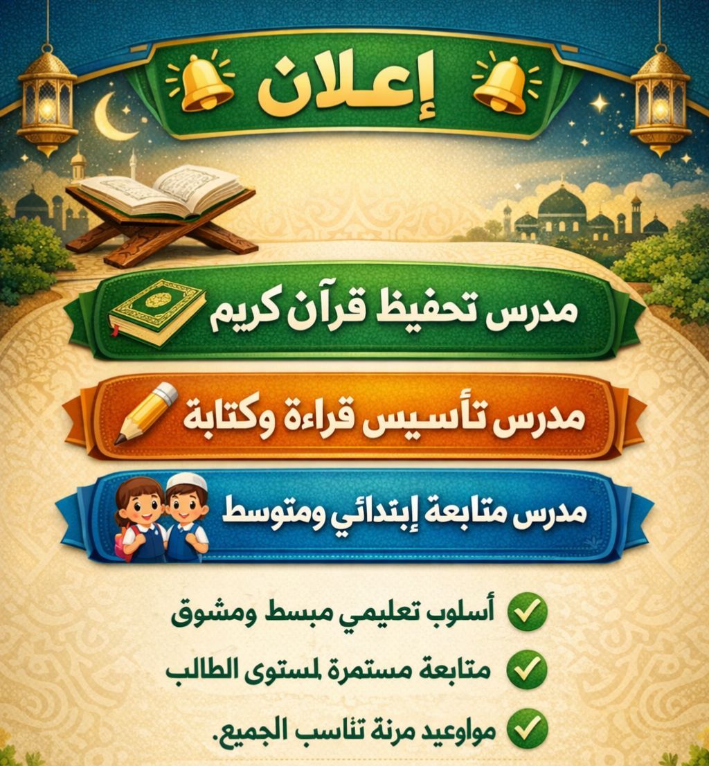 مدرس تحفيظ قرآن كريم مع تصحيح التلاوة واحكام التجويد مدرس تأسيس للمرحلة الأولية (قراءة - كتابة - أملاء - حساب) مدرس متابعة للمرحلتين الابتدائية والمتوسطة في جميع المواد مميزاتنا أسلوب تربوي محفز ومحبب للطلاب متابعة مستمرة لمستوى الطالب خطط فردية حسب احتياج كل طالب خبرة في التعامل مع الطلاب وتحسين مستواهم الدراسي. حي السويدي الغربي