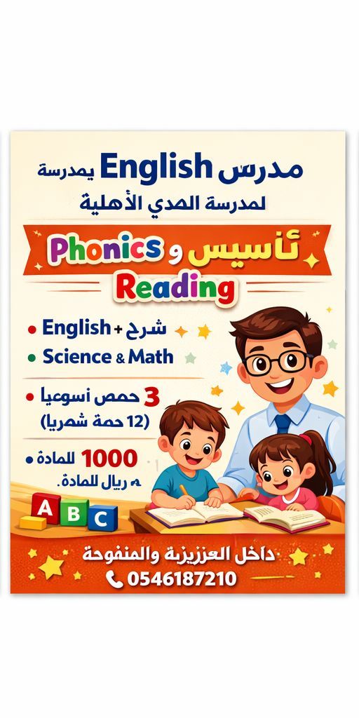 مدرس English تابع لمدرسة الهدي الأهلية، أساعد الطلاب على رفع المستوى وتحسين الدرجات في مناهج International. شرح English مع متابعة Science & Math بنفس السعر. 3 حصص أسبوعيا (12 حصة شهريا) 1000 ريال للمادة. داخل العزيزية والمنفوحة. للتواصل