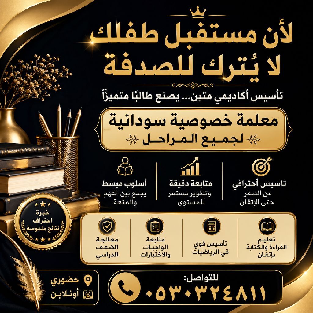 هل ما زال طفلك يعاني من ضعف في القراءة أو الرياضيات لا تقلق الحل يبدأ من تأسيس صحيح معلمة خصوصية سودانية لجميع المراحل تقدم تأسيسا متينا يضمن لطفلك الفهم الحقيقي وليس الحفظ فقط تعليم القراءة والكتابة باتقان تأسيس قوي في الرياضيات متابعة مستمرة للواجبات والاختبارات معالجة الضعف الدراسي بأسلوب مبسط ومحبب للاطفال نؤمن أن كل طفل قادر على التفوق اذا وجد الطريقة الصحيحة