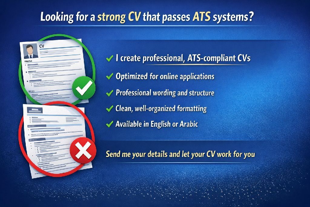 Looking for a strong CV that passes ATS systems I create professional, ATS - compliant CVs Optimized for online applications Professional wording and structure Clean, well - organized formatting Available in English or Arabic Send me your details and let your CV work for