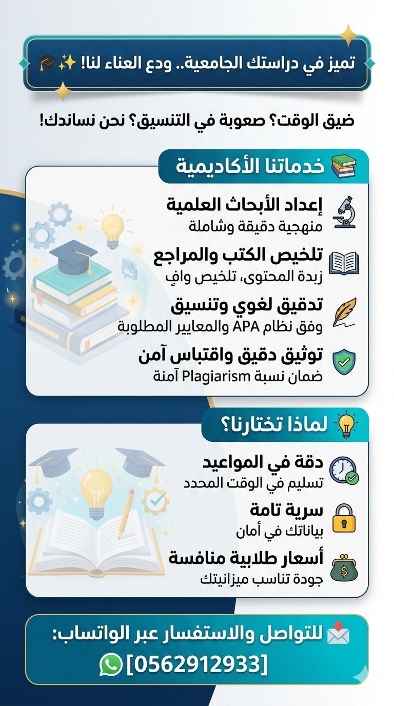 الى طلاب الجامعات الأعزاء. هل تبحث عن التميز الدراسي لا ترهق نفسك في البحث عن المصادر وتنسيق المراجع. نحن نقوم بالمهمة بدلا منك أبحاث علمية رصينة. ملخصات كتب ذكية. تنسيق ملفات وتعديل قوالب. نضمن لك محتوى حصري غير منقول. مراجعة مجانية لأي تعديلات
