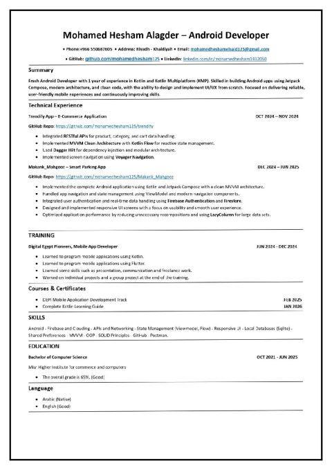 مطور تطبيقات اندرويد باستخدام Kotlin وJetpack Compose، لدي خبرة في بناء تطبيقات حديثة وربطها ب APIs وكتابة كود نظيف وقابل للتطوير. يمكنني تصميم واجهات المستخدم UI / UX من الصفر والعمل على Figma. أستخدم أدوات الذكاء الاصطناعي مثل Make وCursor في تطوير تطبيقات الاندرويد لزيادة سرعة التنفيذ وتحسين الانتاجية. قادر على العمل بشكل مستقل أو ضمن فريق