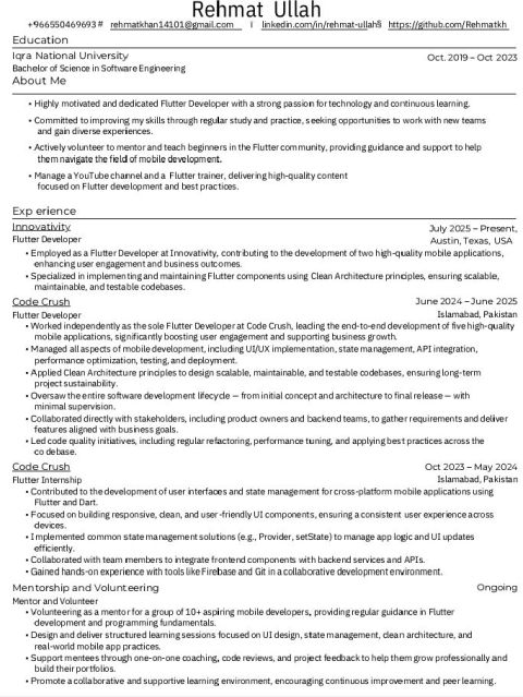أنا مطور Flutter بخبرة تزيد عن 3 سنوات، أقيم حاليا في الرياض وابحث عن فرصة عمل في مجال Flutter داخل المملكة العربية السعودية. مطور Flutter موجه للنتائج، امتلك خبرة قوية في Clean Architecture، وإدارة الحالة باستخدام BLoC وGetX، وتكامل Firebase، وبناء تطبيقات جوال قابلة للتوسع. لدي سجل مثبت في تقديم حلول عالية الأداء وجاهزة للانتاج مع كود نظيف، وأداء محسن، وتجربة مستخدم سلسة