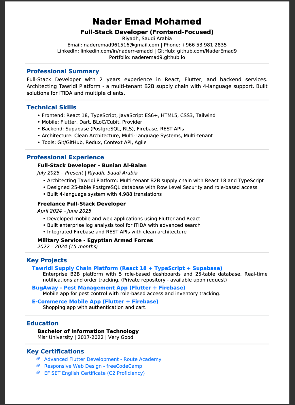 مطور برمجيات محترف خبرة في تطوير تطبيقات الويب والموبايل (React, Flutter, Node. js) جاهز للعمل بدوام كامل في الرياض كاولوية أو عن بعد (إقامة قابلة للنقل)