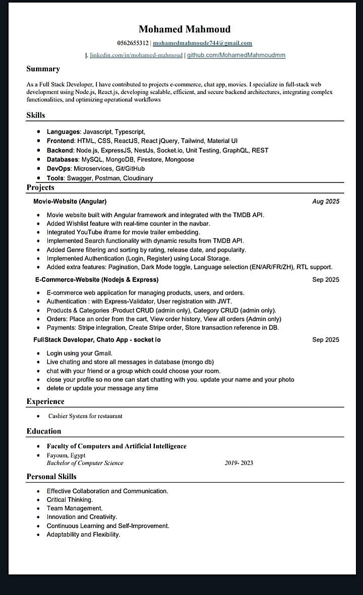 My name is Mohamed Mahmoud, a Computer Science graduate and Full - Stack Developer currently based in Riyadh. I have hands - on experience building scalable web applications using React, Node. js, Express, firebase and MongoDB, with a strong focus on clean architecture, performance, and secure APIs