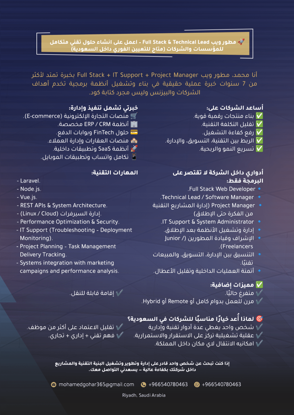 أنا محمد، مطور ويب في الرياض بخبرة أكثر من 7 سنوات عملية فعلية في تطوير وتشغيل أنظمة برمجية تخدم أهداف الشركات والمؤسسات، مع التركيز على الاستقرار، الأداء العالي، وقابلية التوسع. اعمل ك Full Stack Developer - IT support - Project Manager بما يساعد الشركات على تقليل التكاليف التقنية وزيادة كفاءة التشغيل دون الحاجة لتوظيف أكثر من شخص. ماذا أقدم لشركتك تطوير مواقع وأنظمة ويب متكاملة إدارة المشاريع التقنية
