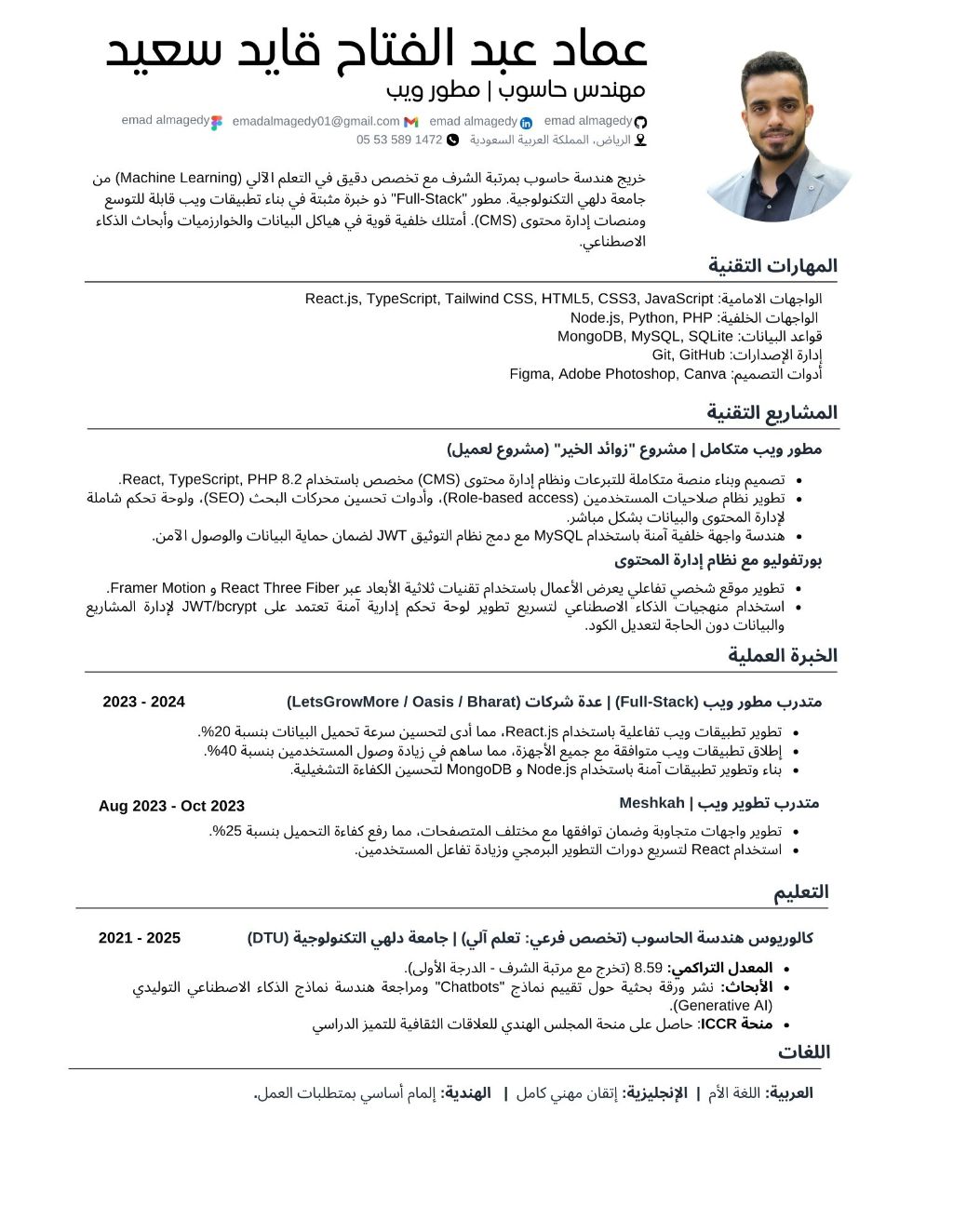 خريج هندسة الحاسوب مع أساس قوي في البرمجة وتقنيات الويب. ابحث عن وظيفة مبتدئة أطبق فيها مهاراتي التقنية، وأساهم في تحقيق أهداف المؤسسة، مع القدرة على العمل أيضا في مجالات الدعم الفني، ادخال البيانات، وخدمة العملاء، مع الحرص المستمر على التعلم والتطوير المهني