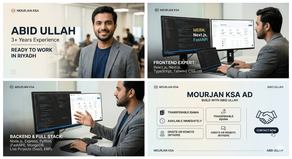Professional Full Stack Developer (MERN/ Next. js/ FastAPI) Available in Riyadh Experienced Software Engineer with 3 + years of expertise in building high - performance web applications. Specialized in Frontend React. js, Next. js, TypeScript, Tailwind CSS. Backend Node. js, Express, Python (FastAPI) MongoDB. UI/ UX Skilled in creating professional, user - centric dashboards and blueprints. Proven track