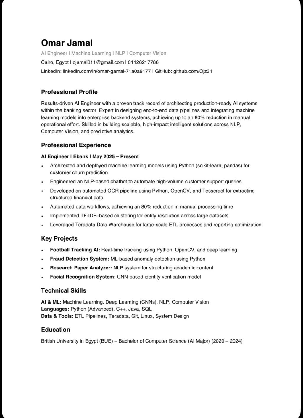 مهندس ذكاء اصطناعي متخصص في تطوير حلول تعلم الآلة ومعالجة اللغة الطبيعية والرؤية الحاسوبية. لدي خبرة في بناء أنظمة ذكية متكاملة من مرحلة جمع البيانات وحتى نشر النماذج في بيئات الانتاج، مع تحسين العمليات وتقليل الجهد اليدوي بشكل كبير. عملت على مشاريع مثل أنظمة التنبؤ، الشات بوت، واستخراج البيانات باستخدام OCR. ابحث عن فرصة في الرياض