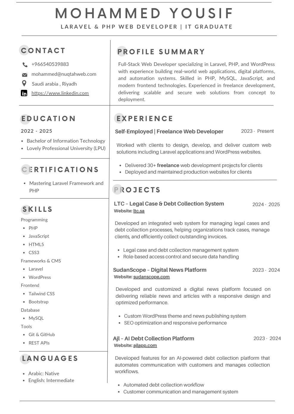 محمد يوسف مطور مواقع Full Stack (Laravel & WordPress) ابحث عن فرصة عمل الرياض خبرتي تطوير مواقع Laravel انشاء مواقع WordPress قواعد بيانات MySQL لوحات تحكم وأنظمة مخصصة ربط APIs والدفع الالكتروني تحسين الأداء وSEO عملت على مشاريع أنظمة إدارة، مواقع شركات، منصات خدمات جودة + سرعة + التزام للتواصل خاص أو واتساب وجاهز أرسل نماذج أعمالي عند الطلب
