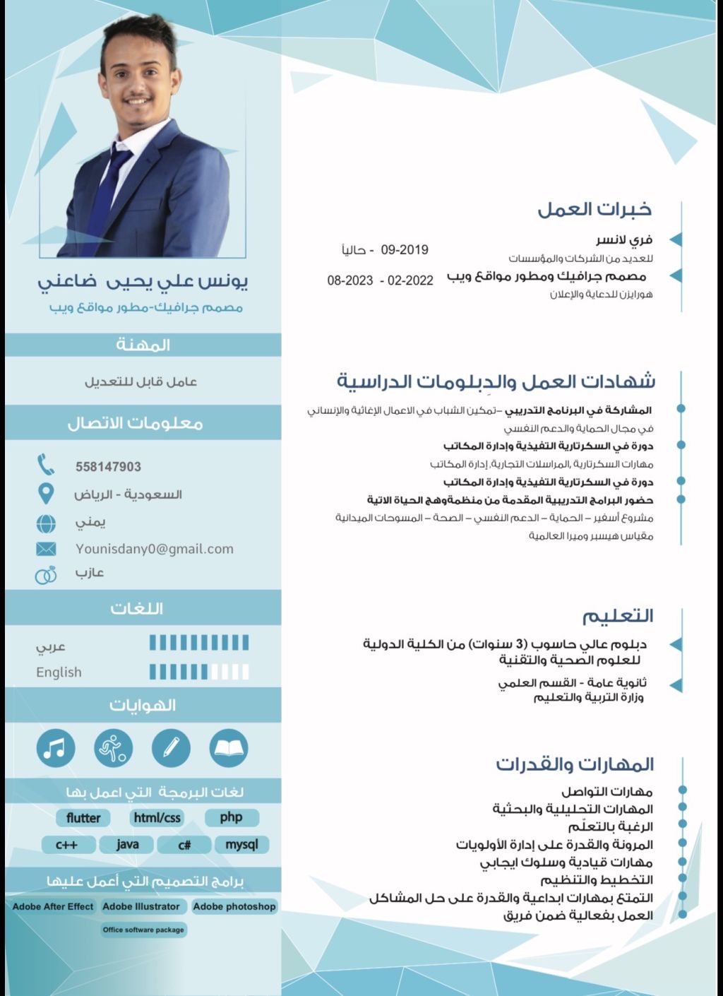 مبرمج Full - Stack متاح للعمل لتطوير مواقع وأنظمة اونلاين + المام بالتصميم خبرة في ادخال البيانات وتنظيمها خبرة في التعامل مع الذكاء الاصطناعي خبرة في جميع برامج الحاسب المعروفة