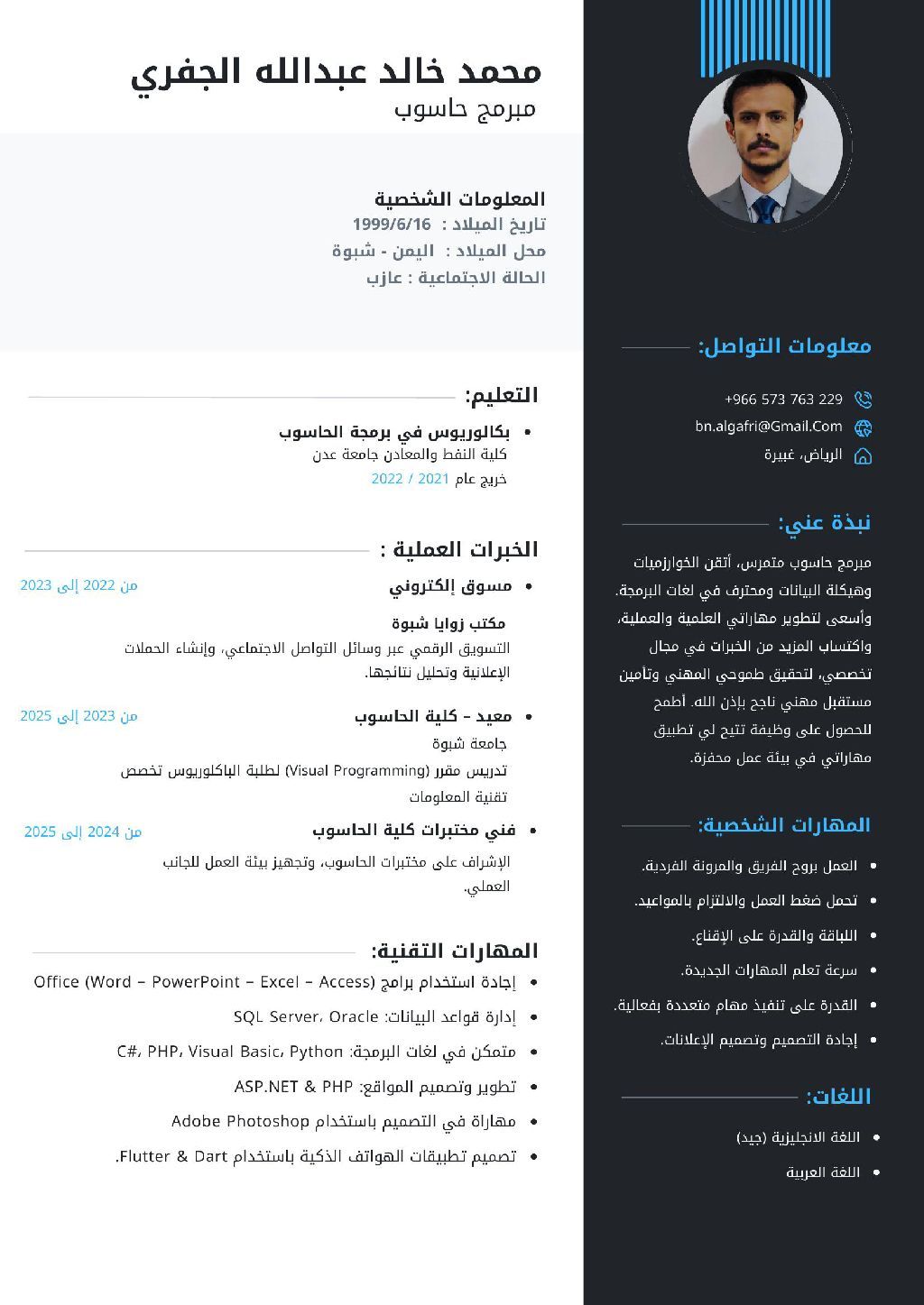 أنا شاب يمني مقيم حاليا في السعودية، خريج برمجة حاسوب ولدي خبرة في تصميم وتطوير المواقع وتطوير التطبيقات، ابحث عن فرصة للعمل في السعودية، متواجد حاليا في الرياض وخبرة في ادخال البيانات، تصميم اعلانات جرافيك بالفوتوشوب أجيد استخدام الكمبيوتر في أغلب استخداماته