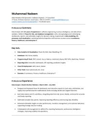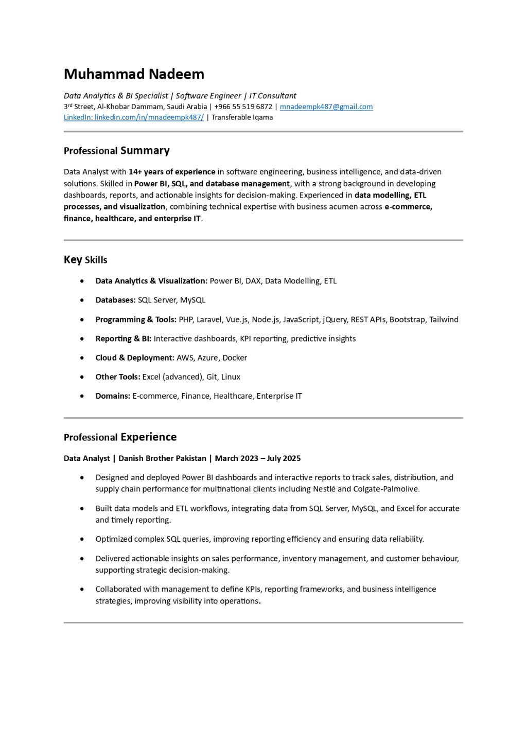 I am Muhammad Nadeem, Data Analytics & BI Specialist, Software Engineer, and IT Consultant with 14 + years of experience in Power BI, SQL, ETL, and software development. Skilled in building dashboards, KPI reports, and predictive insights for multinational clients including Nestlé and Colgate Palmolive. Key expertise Power BI, DAX, SQL Server, MySQL, Data Modelling, ETL, PHP, Laravel, Vue. js, Node
