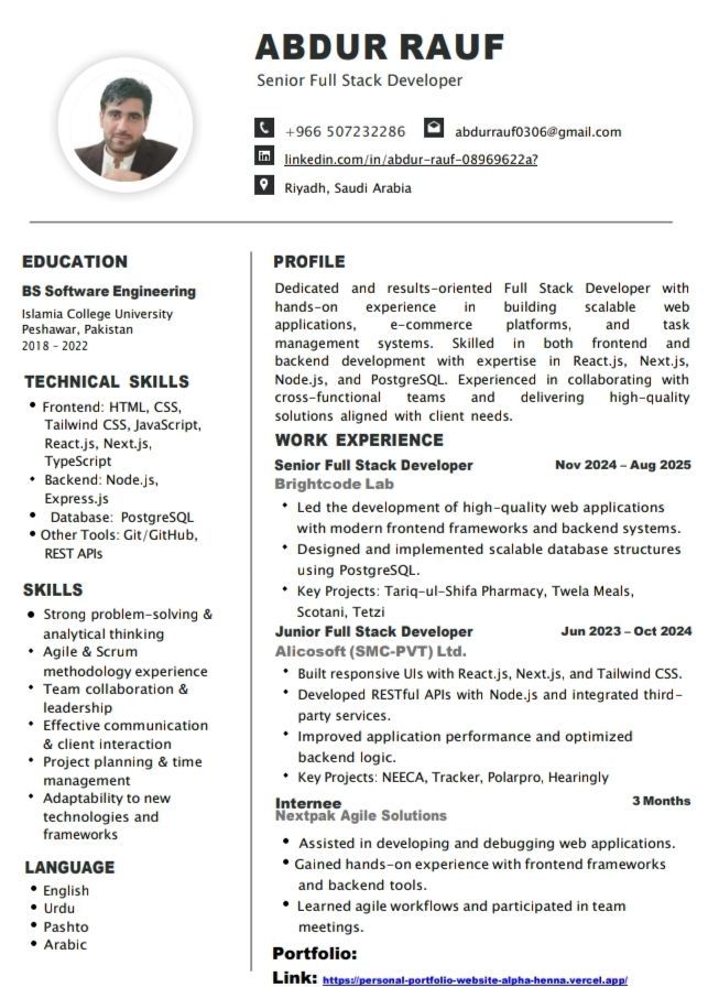 أستكشف فرصا جديدة في المملكة العربية السعودية تتناسب مع خبرتي كمطور ويب متكامل. أنشئ تطبيقات ويب وجوال موثوقة باستخدام React، وNext. js، وTypeScript وReact Native، وNode. js، وExpress وPostgreSQL أهتم بالأدوار التي تمكنني من المساهمة في نمو المنتج، وحل المشكلات الحقيقية، والعمل مع فرق تقدر الهندسة النظيفة والقابلة للتطوير. يمكن لفرق الموارد البشرية أو أي شخص يرغب بالتوظيف التواصل معي عبر