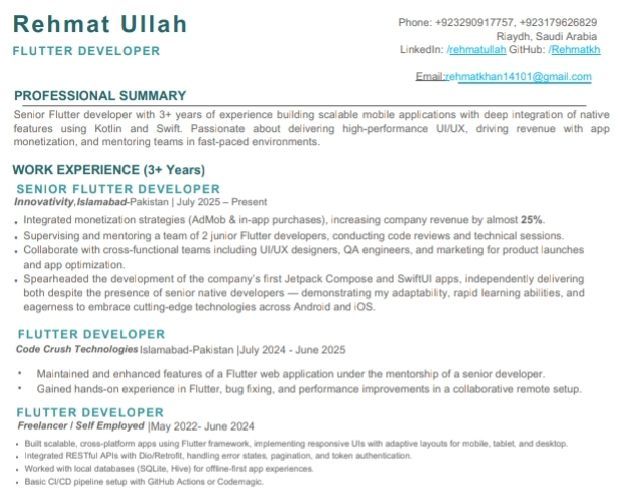 Flutter Developer Mobile Apps (Flutter, Firebase, GetX) Seeking Opportunities in Saudi Arabia Results - driven Flutter developer with proven experience building production apps (UI, state management, Firebase) Skilled in clean architecture, performance optimization, and team collaboration