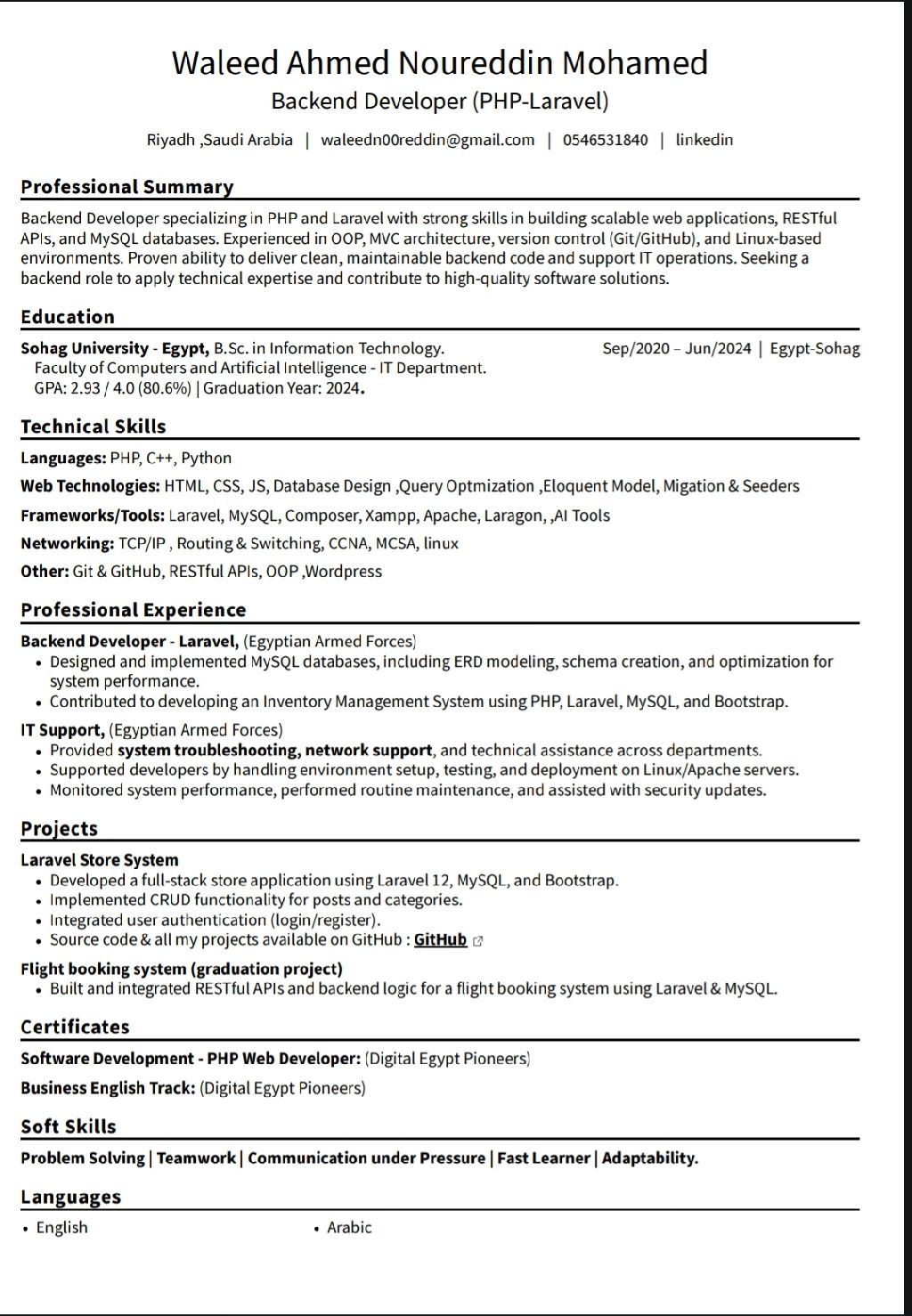 Backend Developer (PHP - Laravel) experienced in building web applications, RESTful APIs, and optimized MySQL databases. Skilled in OOP, MVC, Git, and Linux environments. Developed Laravel systems including inventory and store applications. Strong problem - solving skills with practical experience in troubleshooting, deployment, and system support