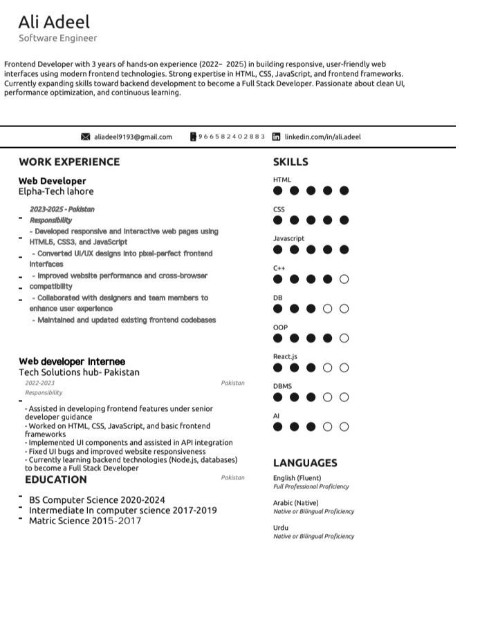Frontend Developer Available Immediately Frontend Developer with 3 years of experience in HTML, CSS, and JavaScript. Experienced in building responsive, user - friendly web interfaces. Currently learning backend development. Available for immediate joining