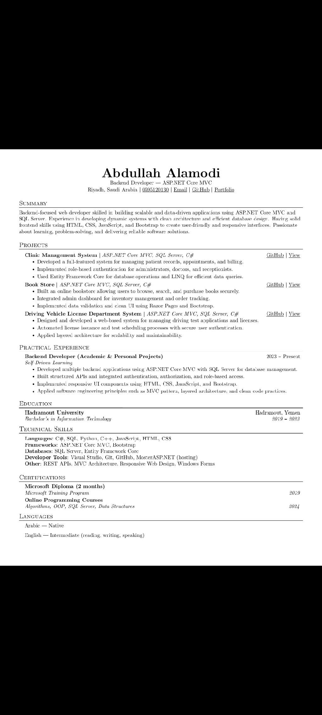 Professional web developer with experience in ASP. NET Core MVC, SQL Server, HTML/ CSS/ JavaScript. Skilled in database design, clean code, and problem - solving. Looking to join a professional team to develop innovative and efficient software solutions