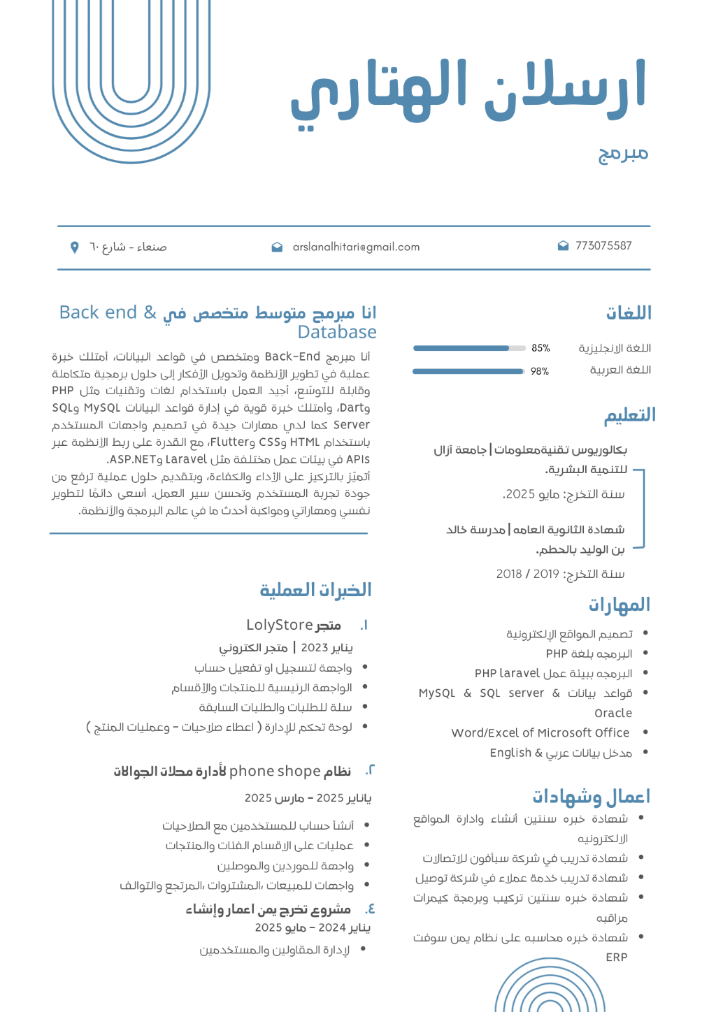 Systems, with hands - on experience in developing scalable applications and transforming ideas into fully integrated software solutions. I am proficient in programming languages and technologies such as PHP and Dart, and I have strong expertise in database management using MySQL and SQL Server. In addition, I have solid skills in user interface design using HTML, CSS, and Flutter, along with the ability