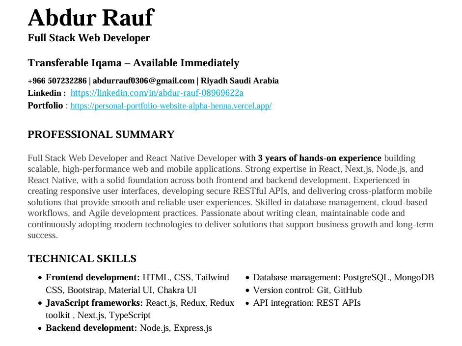 مطور ويب متكامل (Full Stack) بخبرة 3 سنوات في تطوير تطبيقات الويب وتطبيقات الجوال القابلة للتوسع. متمرس في React وNext. js وNode. js وTypeScript وReact Native، مع خبرة قوية في تطوير الواجهات الأمامية والخلفية. خبرة في بناء واجهات مستخدم متجاوبة، وتطوير واجهات برمجية RESTful، وتحسين محركات البحث (SEO) لتطبيقات الويب. قادر على كتابة كود نظيف وقابل للصيانة والعمل بفعالية ضمن فرق التطوير لتقديم حلول