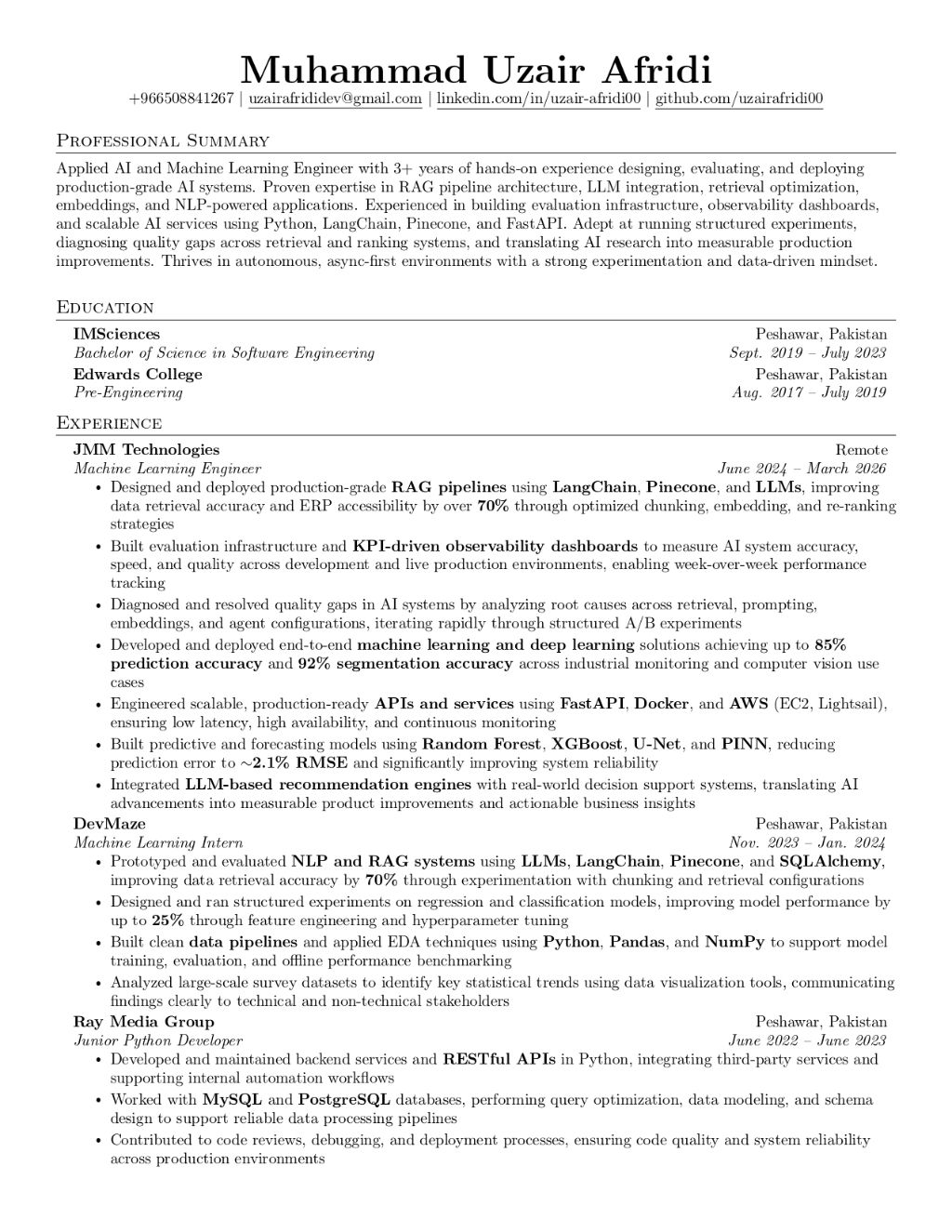 ML Engineer & AI Specialist Available Immediately Riyadh Hi, I am Uzair, a Machine Learning Engineer with 3 + years of experience building production - grade AI systems. I specialize in LLMs, RAG pipelines, agentic AI, and NLP - powered applications, with hands - on experience deploying scalable solutions on AWS using Python, LangChain, FastAPI, and Docker. My recent work includes building RAG systems