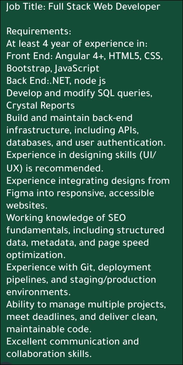 Job Title Full Stack Web Developer Requirements At least 4 year of experience in Front End Angular 4 + HTML 5, CSS, Bootstrap, JavaScript Back End NET, node js Develop and modify SQL queries, Crystal Reports Build and maintain back - end infrastructure, including APIs, databases, and user authentication. Experience in designing skills (UI/ UX) isrecommended. Experience integrating designs from Figma