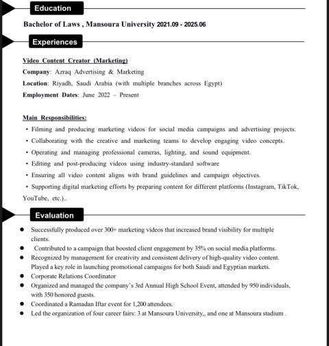 خبرة 3 سنوات في العلاقات العامة وتنظيم معارض ومؤتمرات مع ادارة سوشيال ميديا وتغطية كاملة عن طريق الريلز