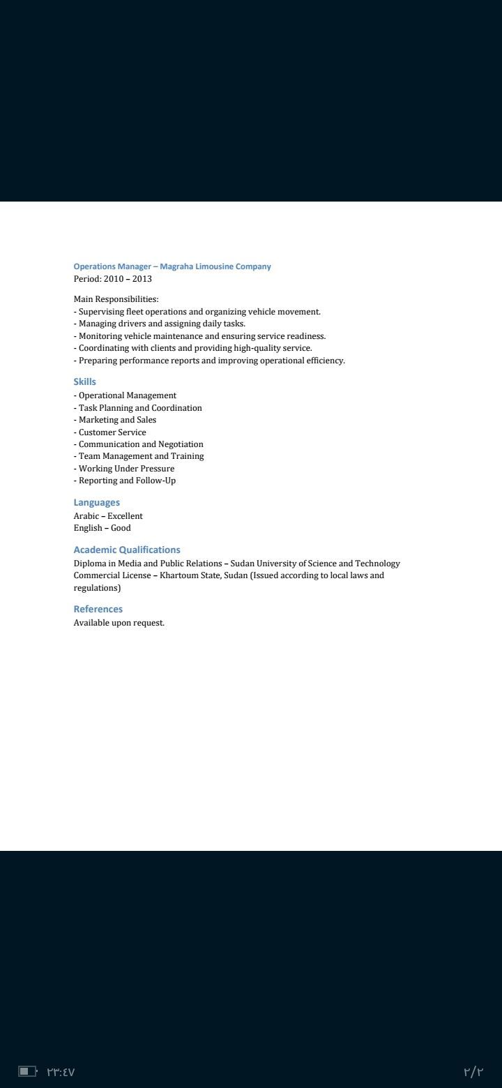 خبرة في مجال إدارة التسويق والمبيعات بالاضافة الى العمل في الإدارة التشغيلية. التفاصيل موضحة على أل CV