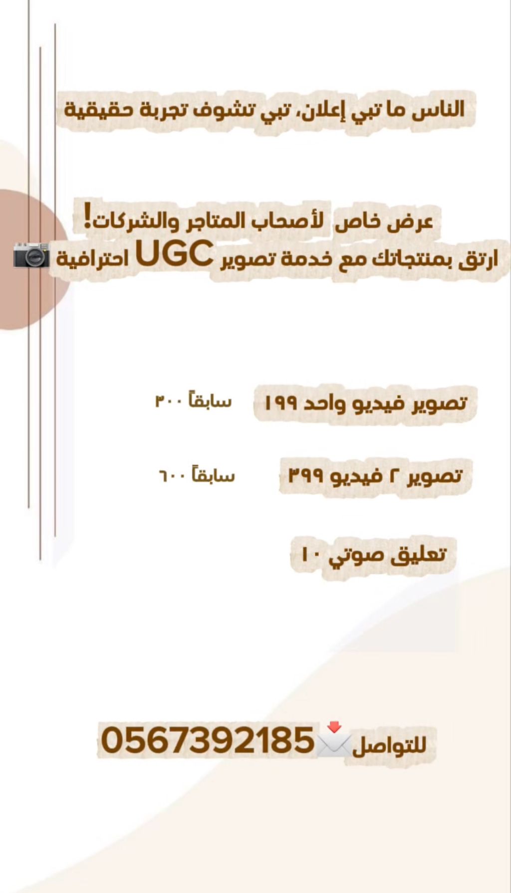 متخصصة في صناعة صور وفيديوهات تعكس هوية العلامة التجارية بروح واقعية وجذابة. أحب أقدم محتوى يعبر عن المنتج بصدق، ويساعد البراند يوصل لجمهوره بطريقة عفوية تعزز الثقة