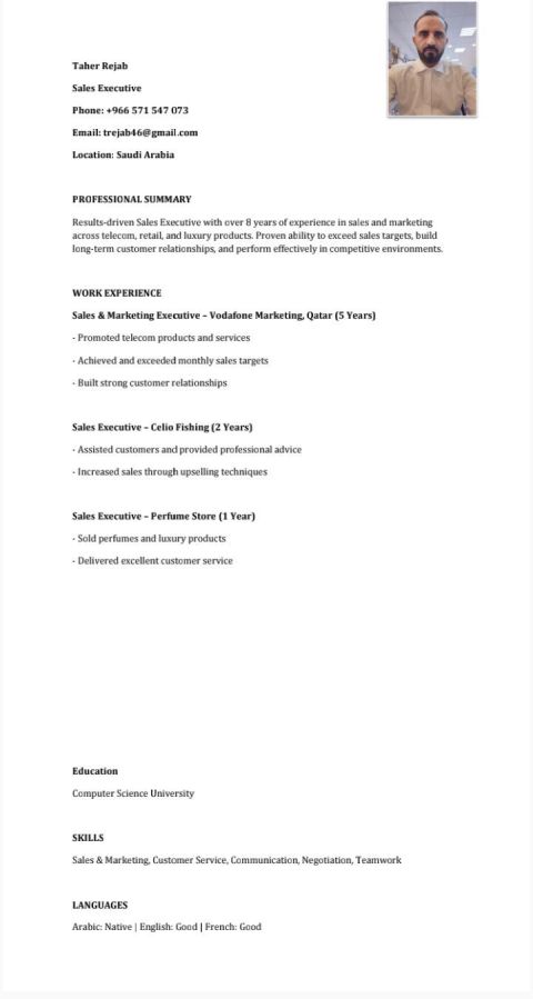 مندوب مبيعات ميداني أو داخلي خبرة 8 سنين في قطر جاهز للعمل في أي وقت في أي منطقة داخل المملكة العربية السعودية