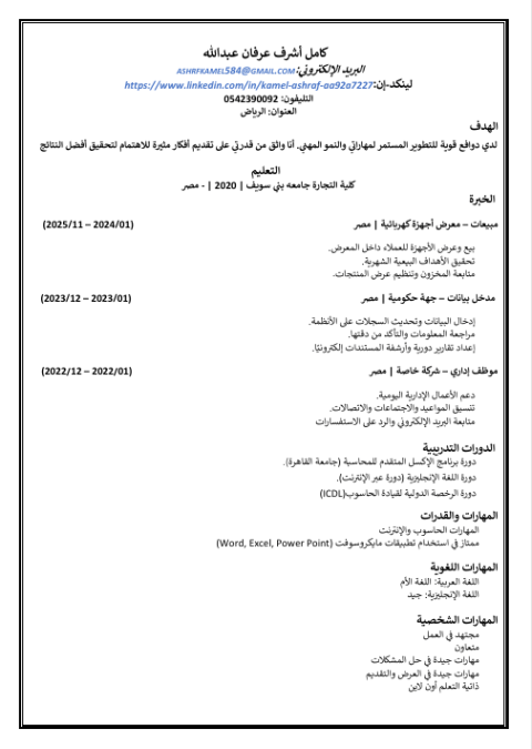 باحث عن فرصة عمل في المبيعات أو مساعد محاسب أو اداري أو ادخال البيانات أو خدمة العملاء أنا كامل أشرف عرفان، ابحث عن فرصة عمل في مجال المبيعات أو مساعد محاسب أو اداري أو أخال البيانات أو خدمة العملاء داخل السعودية - الرياض. لدي خبرة عملية في مبيعات الاجهزة الكهربائية لمدة سنتين بالاضافة الى خبرة في الإدارة وادخال البيانات والحسابات. المهارات التعامل الممتاز مع العملاء وتحقيق الأهداف البيعية. القدرة