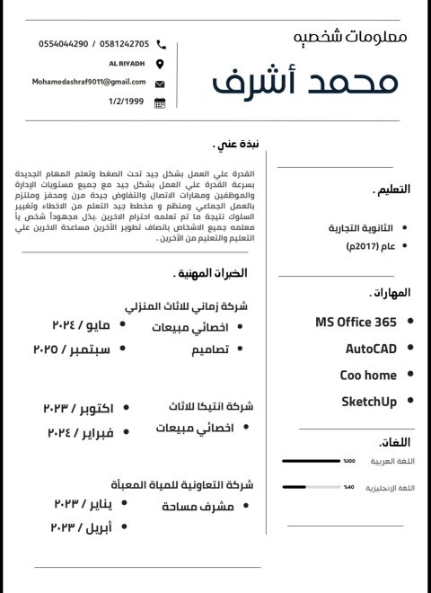 الاسم أحمد محمد. الجنسية مصري. ابحث عن فرصة عمل في مجال المبيعات. الخبرات مشرف مبيعات خبرة في مجال مبيعات الهواتف الجواله أكثر من 18 عام وخبرة في مجال مبيعات المواد الغذائية خبرة في السوق السعودي لمدة سنتين إقامة سارية ورخصة قيادة سارية القدرة على التفاوض والتعامل المباشر مع العملاء. ملتزم. منظم. طموح. متفرغ للعمل فورا للتواصل عبر الواتساب أو الاتصال المباشر