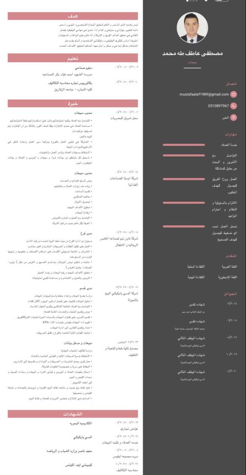 مندوب مبيعات خبرة في عدة قطاعات متخصص في إدارة المناطق البيعية، فتح أسواق جديدة، وتنمية حجم المبيعات. امتلك خبرة قوية في استقطاب عملاء جدد وبناء قاعدة عملاء نشطة، تحقيق المستهدفات البيعية وزيادة حجم المبيعات، التفاوض واغلاق الصفقات بكفاءة، متابعة التحصيل وتقليل المديونيات، معرفة جيدة بالمنافسين والسوق