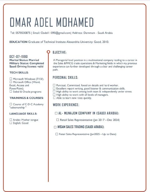 مندوب مبيعات محترف بخبرة في قطاع الملابس والمواد الغذائية، متخصص في تنمية المبيعات الميدانية، وإدارة حسابات العملاء، وفتح أسواق جديدة. لدي سجل في تحقيق التارجت وزيادة حجم الطلبات من خلال مهارات العرض والتفاوض والمتابعة الدورية لنقاط البيع. أجيد قراءة احتياج العميل واقتراح المنتجات المناسبة، مع التزام كامل بالانضباط وجودة الخدمة