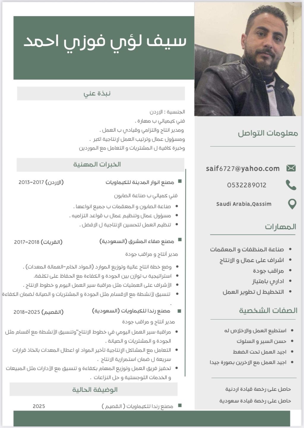 فني كيميائي ومدير انتاج في مصانع الصابون ذو خبرة كافية وهذا CV صورة