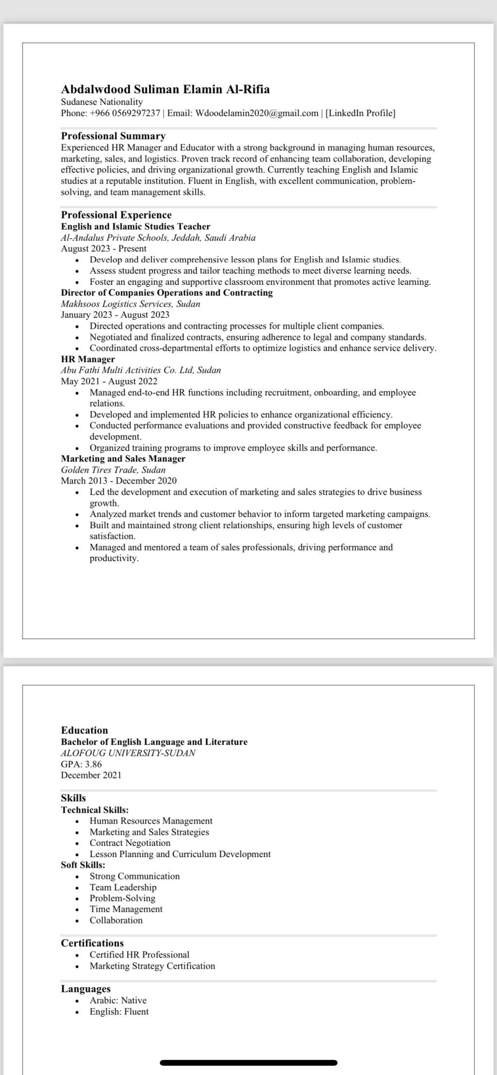 تخصصي بكالوريوس لغة انجليزية عملت في مجال التسويق والمبيعات وكذلك قسم HR’ والسكرتارية وقسم تعاقد الشركات المشغلة’ ومعلم لغة انجليزية ودراسات اسلامية لمدة 3 أعوام ابحث عن وظيفة ادارية أو مجال اداري. منطقة الإقامة الحالية جدة. أتقن مهارات التواصل المؤسسي ومهارات الاتصال المباشر
